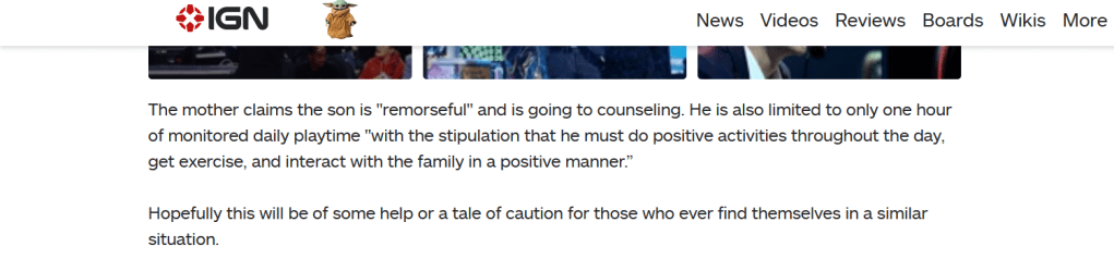 What I was pleased to see in the article is that the mother of the teenager is acting on the situation, has her son in counseling and is now taking a more proactive approach in monitoring how much time he spends playing video games. It can be very easy to criticize the mother in this situation but let’s be honest. Nobody is perfect and parents are not going to always notice everything going on with their children. Sometimes it will take a major event to happen in order to expose parents to what is truly going on.