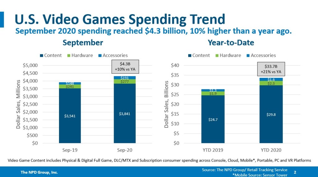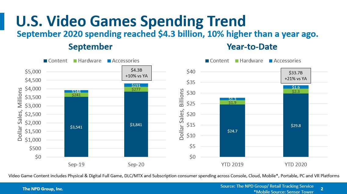 Even being in the midst of a COVID-19 pandemic and adjusting to a different way of life has not slowed the video game industry in the United States. According to the latest financial report by The NPD Group, video game spending totaled $4.3 billion just for the month of September and a stupendous $33.7 billion for the year. Video game consumer spending in September 2020 saw a 10 percent increase from September 2019. While there is a lot of uncertainty within the world today, what is for sure is that the video game industry continues to prosper despite it.