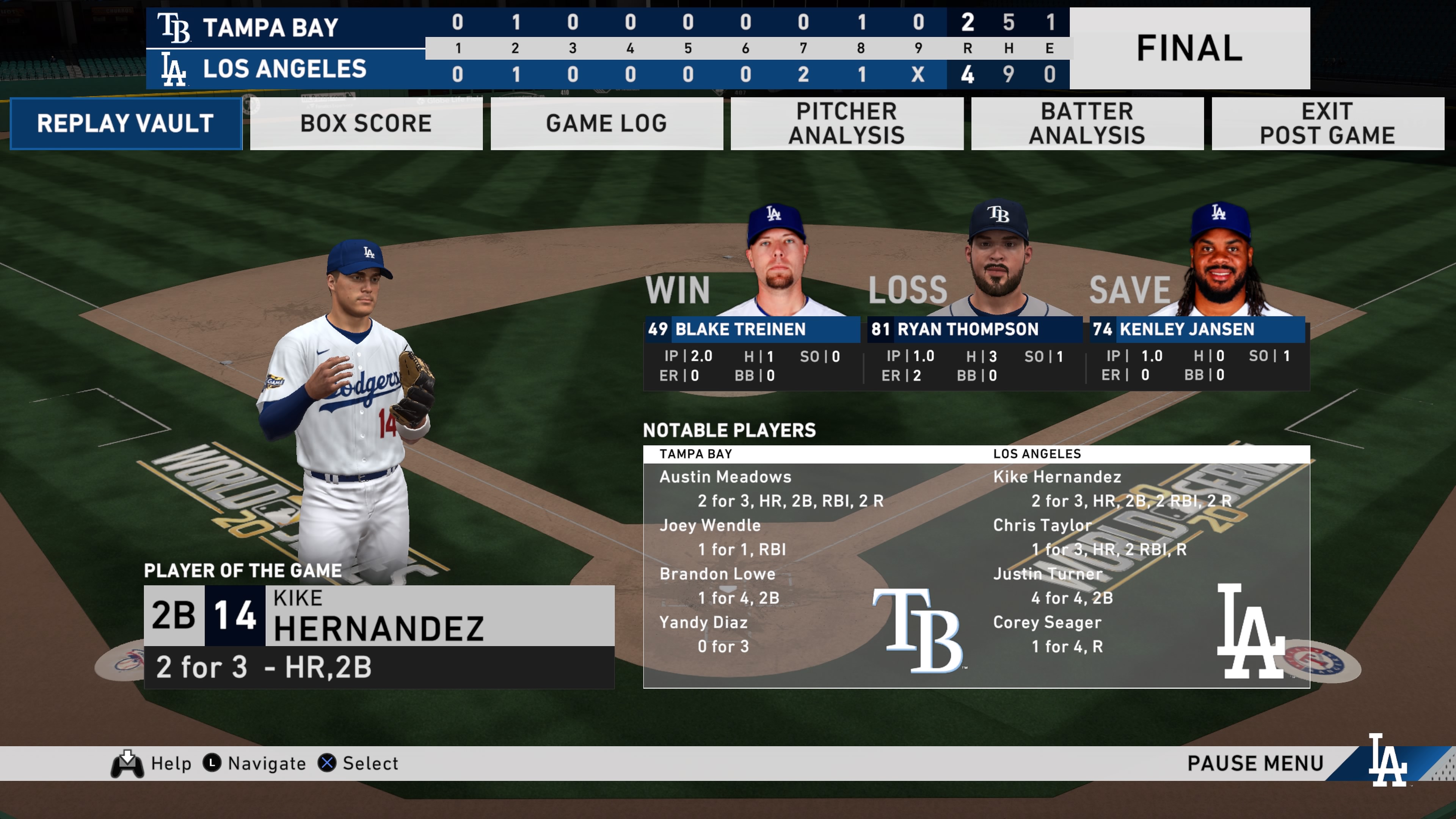 Using the game’s “Living Rosters,” I set up a game between the Dodgers and the Tampa Bay Devil Rays at Global Life Field. I also used the same starting pitchers with Tony Gonsolin for L.A. and Blake Snell for the Rays. As in real life, Tampa Bay went up on me early in the second inning with a homer, except it was by Austin Meadows instead of Randy Arozarena. I tied the score at 1-1 in the bottom of the 2nd, but it was Kike Hernandez’s two-run home run in the 7th that broke the game open. The Rays threatened in the 8th by scoring a run and cutting my lead to, 3-2. But Chris Taylor’s solo shot in the bottom of 8th gave me the cushion I needed to finish off Tampa Bay, 4-2. Justin Turner ended up going a perfect 4-for-4 in the game.
