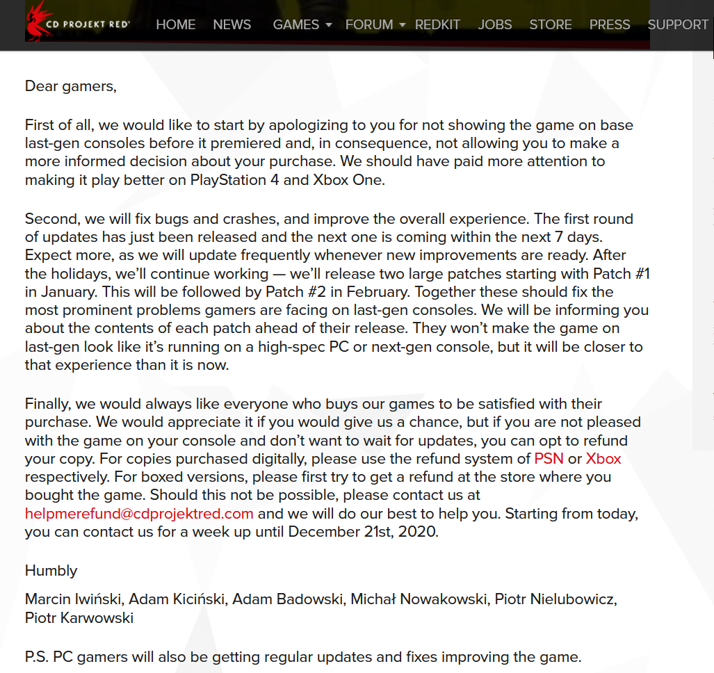 A message from CD Projekt Red on December 14, 2020 apologizing for the problem-riddled launch of Cyberpunk 2077.