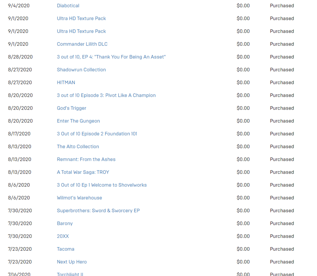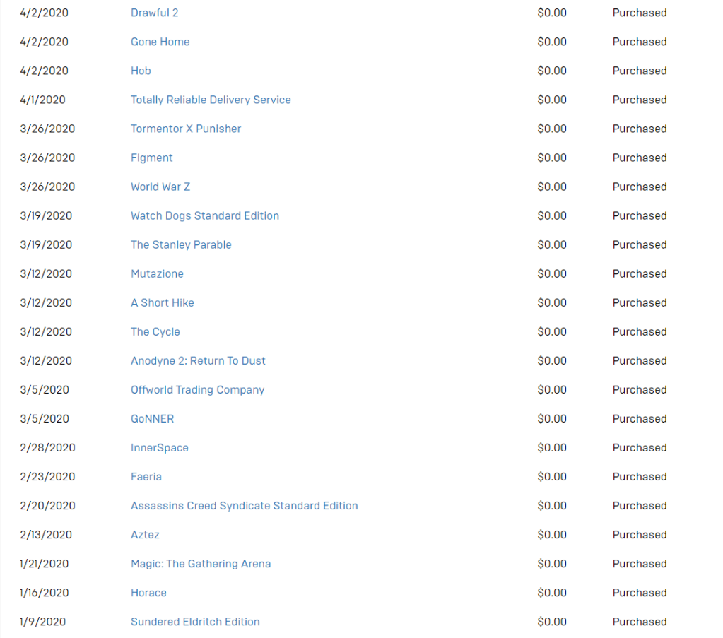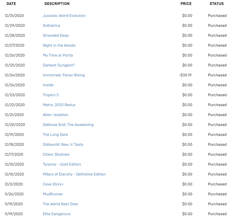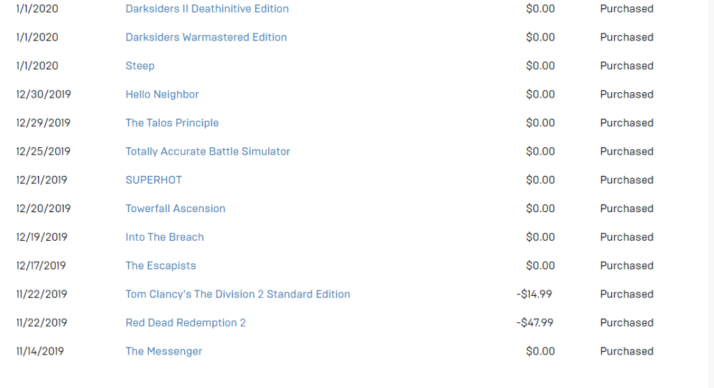 Please look through my Epic Games transaction history above to see why I am pointing this out. You will find a whole list of games that I have acquired through the application since November 2019. I found out about the Epic Games app because The Messenger was being given away for free. So I signed up. Since then, I have built a collection that only has three games that I have actually purchased from the platform. It was to the point that purchasing Immortals: Fenix Rising was the least I could do for everything Epic Games has provided throughout the year.