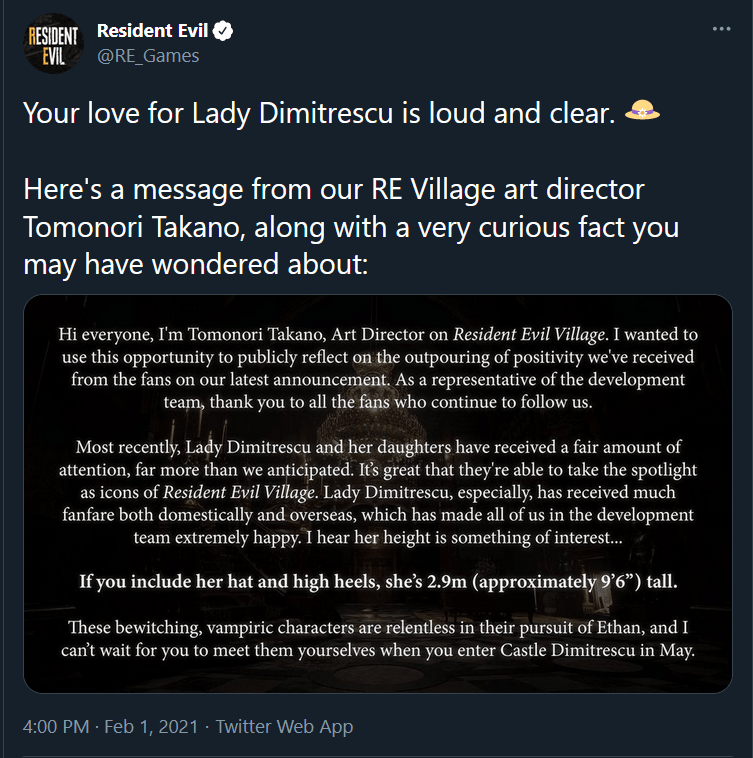 Resident Evil Village Art Director Tomonori Takano confirmed that with her hat and heels include that Dimitrescu measures 9 1/2 feet tall. That makes for a very towering and intimidating presence. It will be interesting to see how the full game plays out and how it is received when it is released in early May. I’ve never been one to play the Resident Evil games myself, but I do appreciate its story and history that now spans more than two decades.