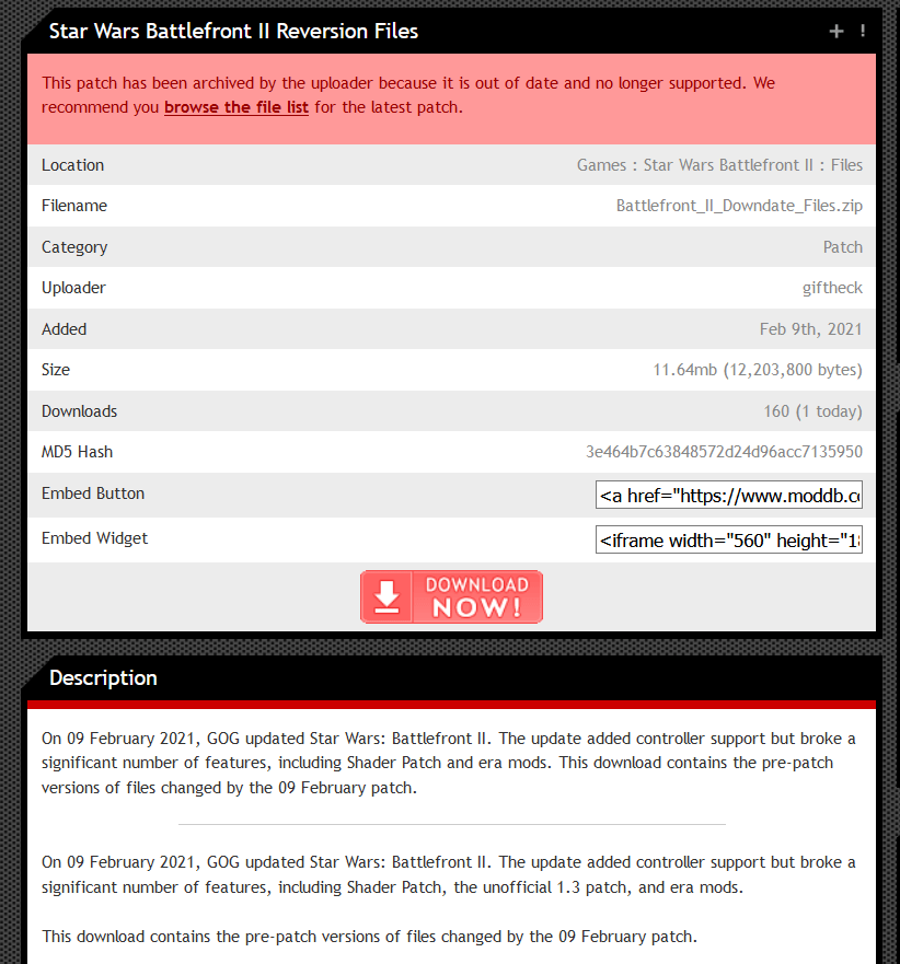 I found out about the news on Tuesday evening through the video above where Savage01st broke down the effects that the update had on mods and other areas of gameplay. I highly recommend Savage01st’s YouTube channel if you are a fan of the Star Wars Battlefront series. Being that the original Star Wars Battlefront II is one of my favorite games, this was not news that I desired to hear. I have more than 150 gigabytes of mods that I have downloaded and added to the game over the years. The notion that all the time I spent waiting for downloads to complete and time spent installing the mods (and troubleshooting them) only for it to go up in smoke because of an update was annoying. But for me, at least I had the solution of going back to my disc version of the game. What about those who only purchased the game through Steam or GOG?