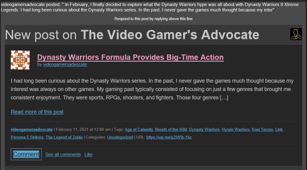 Hey everyone. For those of you who received an email about a new post entitled “Dynasty Warriors Formula Provides Big-Time Action,” I apologize but that post is not ready to go public. I pressed “Publish” by accident on what is only essentially a draft. So if you click the link, it will not take you to the article. Again, I apologize for the mistake and I appreciate all of you who subscribe to my blog and do my best to be mindful of your email inboxes. This post will be ready to go live in March. Thanks for your understanding.