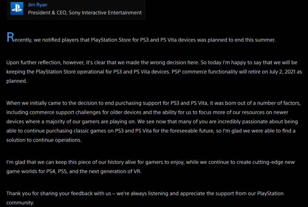 Earlier this week, Sony Interactive Entertainment CEO Jim Ryan released a statement that indicated that Sony was reversing course on its decision to shut down the digital stores. Ryan pointed out that the decision was made “upon further reflection” and referred to the company’s initial stance as the “wrong decision.” So in the meantime, the PS3 and Vita stores are safe. But this is not the case for PSP owners, as the store on the platform will still shut down this summer.