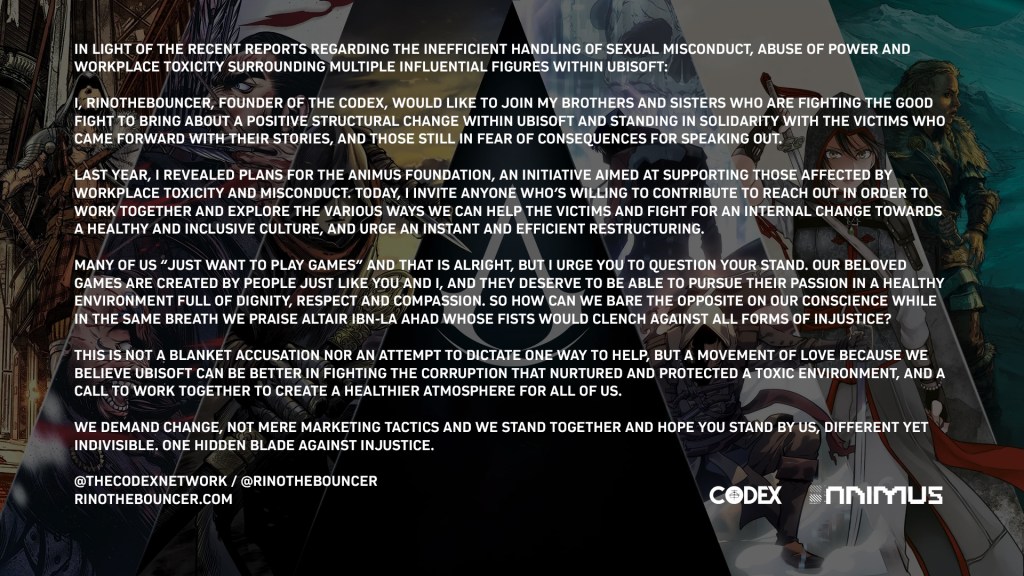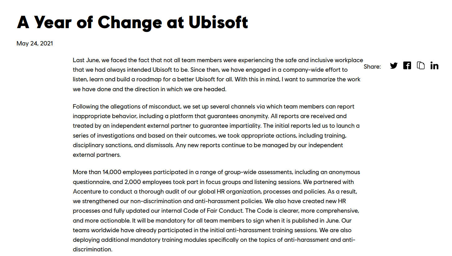 There is an updated post by Ubisoft CEO Yves Guillemot that is dated May 24th on the Ubisoft website. In it, he laid out how the organization has appointed several new executives and engaged more than 10,000 employees over the past year. But is what the company doing enough? The #HoldUbisoftAccountable movement does not think so.