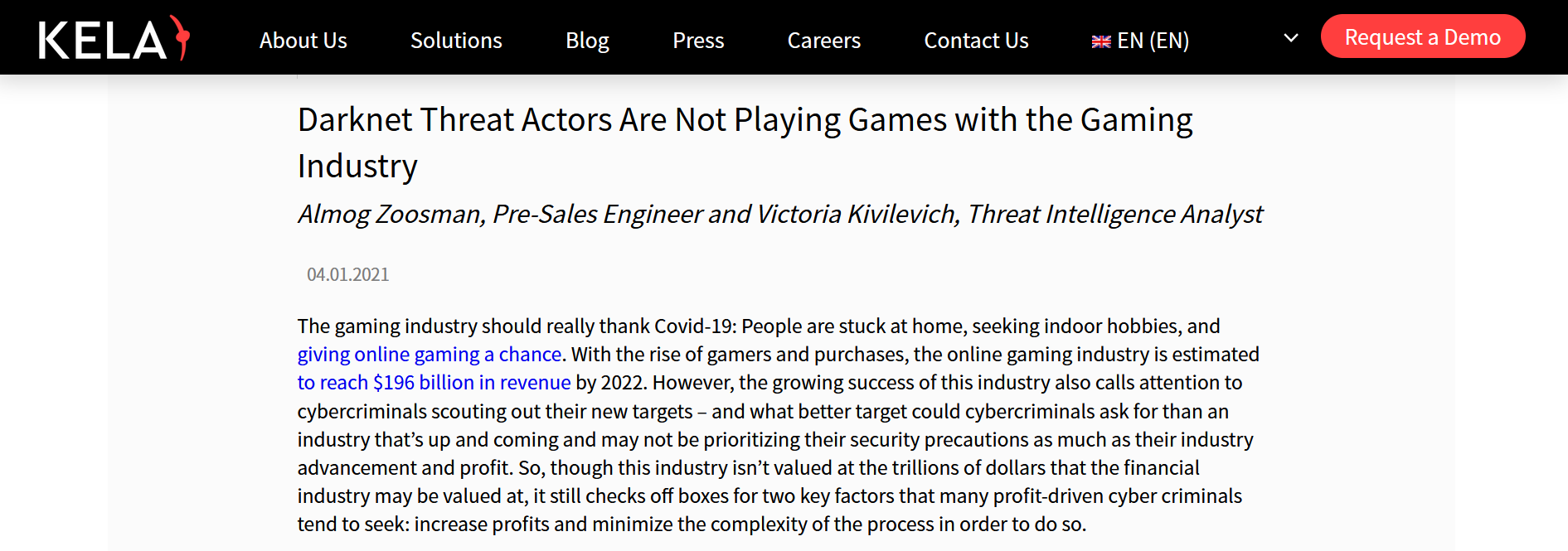 The success and booming business of gaming has been one of the key reasons that gaming organizations have been on the radar of hackers. Multiple companies are bringing in billions of dollars a year, which has been specifically tied to the success of online gaming. This was noted in an online article by KELA, a research company that investigates and reports on cybercrimes and the Involvement of the Dark Web. The data that is stolen through cyberattacks are often sold through platforms such as the Dark Web. Earlier this year, data from CD Projekt Red reportedly sold for several million dollars on that platform.