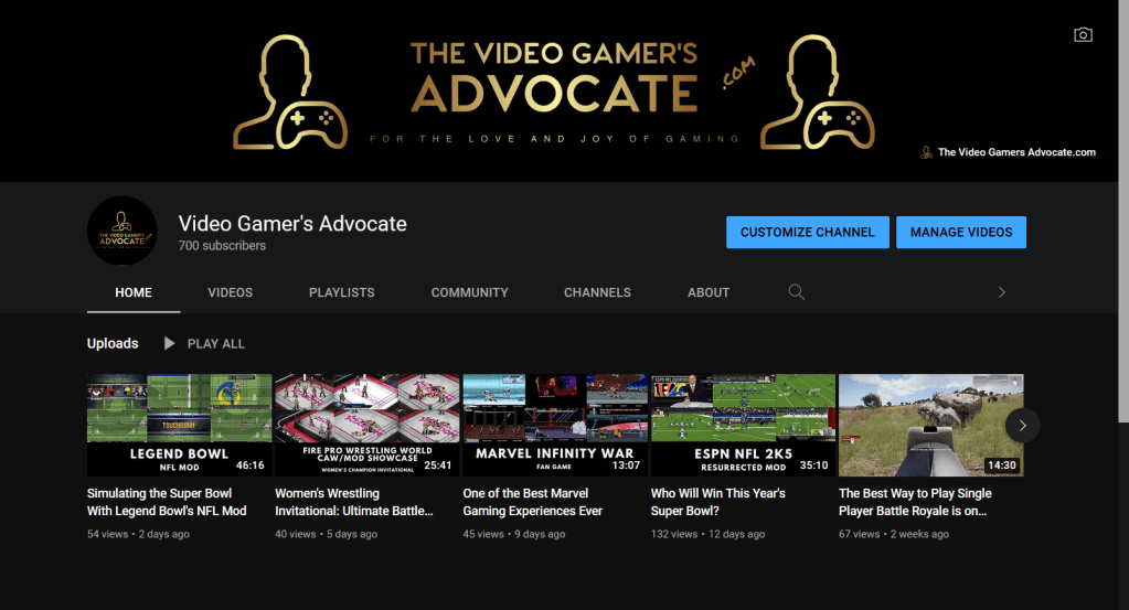 At the start of this year, it became clear to me what I wanted to channel to be at this point. The Video Gamer’s Advocate YouTube Channel is a place where you will experience a focus on PC gaming mods, awesome fan-created games, and occasional gameplay videos of a game that I may just want to showcase. You will see plenty of first-person shooters, sports, and wrestling videos because I truly love playing those games and exploring the plethora of mods that are associated with them. My goal has been, is, and will continue to be about building a channel that represents me.